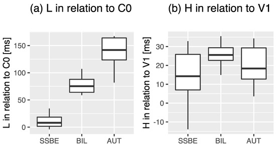 | 10 | It is sometimes argued that alignment is best expressed as a proportional measure, for instance as a ratio of the accented syllable (e.g., Silverman and Pierrehumbert 1990). We therefore calculated the alignment of the start of the rise and that of the end of the rise as a proportion of the syllable duration. This did not change our results. An ANOVA with proportional alignment of L as dependent variable and speaker group as independent variable showed a significant effect of speaker group (F[2,21] = 80.9, p < 0.001) and post-hoc t-tests with Bonferroni correction showed significant differences between the monolingual SSBE and AUT (p < 0.001), between SSBE and BIL (p < 0.001), and between AUT and BIL (p < 0.01). For proportional alignment of H, no effect was found (F[2,21] = 0.24, n.s.). |