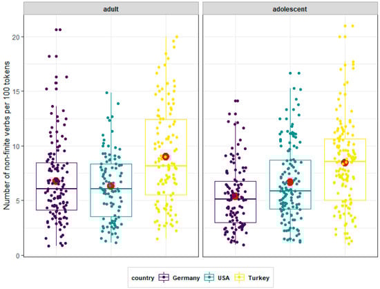 In Figure 1, we present the occurrence of non-finite verbs (nfV) in adults and adolescents in the three groups. The numbers are normalized per 100 tokens in the corpus. The red dots inside the box plots indicate the mean occurrence of non-finite verbs per group. We see that non-finite verbs are most frequent in Turkish monolinguals across both age groups, adults with mean = 9.00 nfV (SD = 4.53) and adolescents with mean = 8.43 nfV (SD = 4.05). The right-hand plot in Figure 1 shows that there is a cline in the adolescent group’s nfV production which goes from Turkish monolinguals (nfV mean = 8.43; SD = 4.05) > heritage Turkish in the US (nfV mean = 6.64; SD = 3.48) > heritage Turkish in Germany (nfV mean = 5.35; SD = 2.88). However, the plot on the left-hand side shows that this is not generalizable across age groups since adult HS groups switch positions along the cline yielding Turkish monolinguals (nfV mean = 9.00; SD = 4.53) > heritage Turkish in Germany (nfV mean = 6.74; SD = 3.65) > heritage Turkish in the US (nfV mean = 6.31; SD = 3.06). Overall, the big stretch of the boxplots and the distribution of the per-speaker data points show that there is large variation in the use of non-finite verbs within each group which ranges from 0 occurrences to more than 22 per 100 tokens.