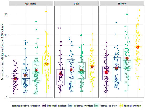 Box-plots that represent the distribution of non-finite verbs by speakers from the three countries with the focus on register and mode.
