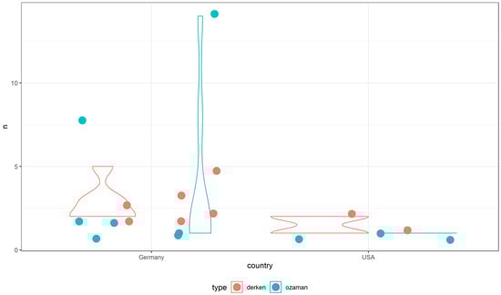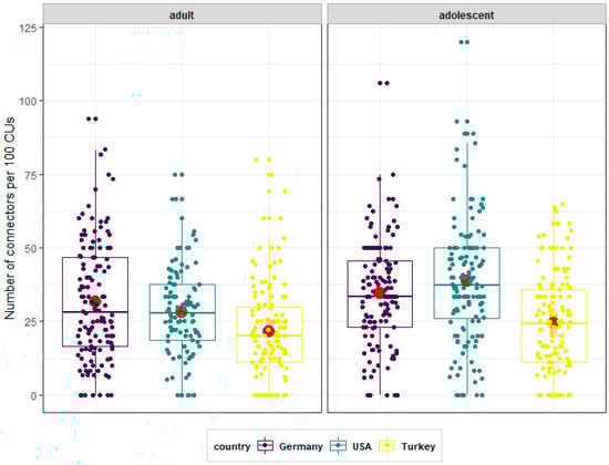 In Figure 3, we see that connectors are more frequently used in Turkish HS as opposed to monolinguals across both age groups, adults and adolescents. The right-hand plot in Figure 3 shows that there is a cline in the adolescent group’s connector production which goes from heritage Turkish in the US (connectors mean = 38.7; SD = 21.04) > heritage Turkish in Germany (connectors mean = 34.6; SD = 17.9) > Turkish monolinguals (connectors mean = 24.4; SD = 17.2). However, again the plot on the left-hand side shows that this is not generalizable across age groups since in the adult group the heritage groups switch positions along the cline yielding heritage Turkish in Germany (connectors mean = 31.7; SD = 20.00) > heritage Turkish in the US (connectors mean = 28.2; SD = 15.5) > Turkish monolinguals (connectors mean = 21.6; SD = 16.5).
