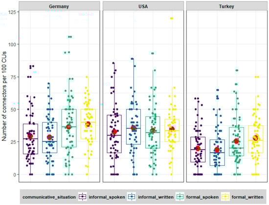 Figure 4 presents connector use per 100 CUs with the focus on register and mode. Again, we see that HS use connectors more frequently than monolinguals, but unlike the use of non-finite verbs, a higher use of connectors by the HS groups seem to hold for every communicative situation. Moreover, there is no apparent difference in the use of connectors across different communicative situations in the three country groups. For instance, monolinguals in Turkey use on average 19.9 connectors (SD = 15.3) in the informal spoken communicative situation, 19.0 connectors (SD = 16.5) in the informal written, 25.6 connectors (SD = 18.2) in the formal spoken, and 27.7 connectors (SD = 16.00) in the formal written communicative situation, while HS in Germany use on average 29.3 connectors (SD = 18.2) in the informal spoken, 28.3 connectors (SD = 17.2) in the informal written, 36.3 connectors (SD = 21.8) in the formal spoken, and 38.5 connectors (SD = 16.9) in the formal written communicative situation, and HS in the U.S. use on average 32.5 connectors (SD = 21.4) in the informal spoken, 35.6 connectors (SD = 20.4) in the informal written, 33.5 connectors (SD = 19.6) in the formal spoken, and 34.5 connectors (SD = 17.6) in the formal written communicative situation.