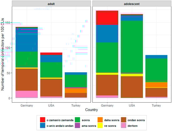 The frequencies of these connectors are illustrated in the bar plots in Figure 5. From the color code used, we see that there is a clear preference for certain temporal connectors in all the varieties of Turkish, sonra (n = 223) “then” and its variant ondan sonra (n = 147) “after that” being the most frequent ones. Then we find o anda “at that moment” (n = 59), o zaman “then” (n = 32), and derken “just then” (n = 25) with relatively moderate frequencies in the corpus. Strikingly, the connector daha sonra “even later” is only present in the monolingual Turkish data. Further variants of sonra only show occasional presence in the data across all varieties of Turkish. Furthermore, there are two connectors which almost exclusively show up in the heritage varieties, namely o zaman “then” and derken “just then”.