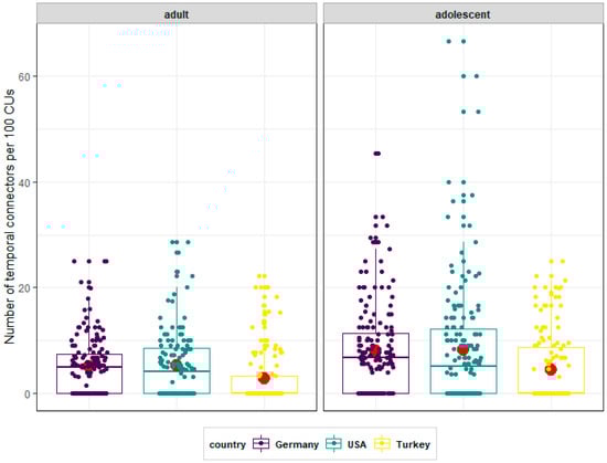 Box plots for individual participants’ number of temporal connectors per 100 CUs.