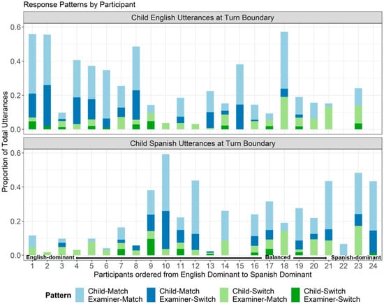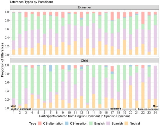 The 24 participants in the current study represent a convenience sample of those children who were able to complete the conversational language sample task while participating in the larger project. These children tended to have slightly higher language scores (mean Language Index of 106) than the original full sample of 62 (mean Language Index of 102) and were more likely to be female (17/24 compared to 37/62) and attend dual-language schools (16/24 compared to 28/62); otherwise, the demographics are largely representative of the original sample. The proportion of children identified as at risk for DLD in this subsample (5 out of 24 children) was comparable to that of the full sample (15 out of 62 children). Children with DLD were included in the current study to examine code-switching in children across a spectrum of abilities, as the findings from this exploratory study may have implications for clinical language assessment. The sub-group of children with DLD in the current study was too small to conduct formal group comparisons, but a continuous measure of overall language ability was included as a potential predictor to account for the wide range of language skills. Excluding children with DLD did not change the major patterns of findings, with a few exceptions that are noted in the Results.