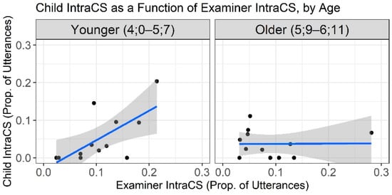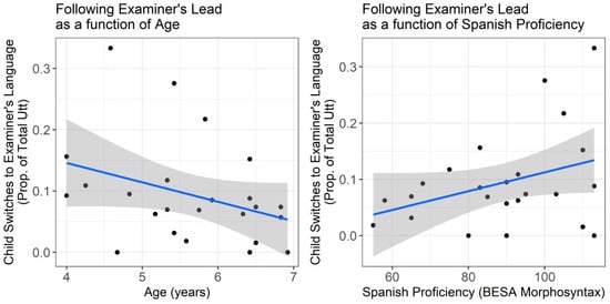 Many studies of code-switching in young children have assumed that limitations in linguistic or grammatical knowledge in the target language of the interaction drive children’s tendency to code-switch, especially when interacting with a conversation partner who prefers one language (e.g., bilingual bootstrapping, Gawlitzek-Maiwald and Tracy 1996; lexical gap hypothesis, Nicoladis and Secco 2000). A variety of studies have linked children’s use of code-switching in single-language contexts with proficiency and suggested that children are more likely to switch from their weaker language to their stronger language (Gross and Kaushanskaya 2020; Gutierrez-Clellen et al. 2009; Paradis and Nicoladis 2007). Children’s code-switching patterns have been suggested to change over time with maturation, including increases in intra-sentential code-switching and shifts in the use of content vs. function words when code-switching (e.g., Montanari et al. 2019; Smolak et al. 2019). It can be difficult to disentangle the effects of age and proficiency, as proficiency also tends to increase and shift with age. However, Montanari and colleagues found that proficiency was less associated with children’s use of code-switching as they aged.