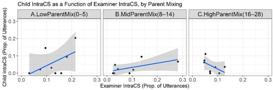 Caregivers also completed two measures specific to code-switching. The language mixing scale (Byers-Heinlein 2013) provided an overall language mixing score that incapsulates how often caregivers codeswitch, particularly intra-sententially (e.g., start a sentence in Spanish and finish in English, and borrow words from English when speaking Spanish) when interacting with their child. Similar to the validation study by Byers-Heinlein, the ratings for the five items by parents in our full sample (Gross and Kaushanskaya 2019) all loaded on a single factor, accounting for 62% of the variance, with high factor loadings (0.73–0.83). The average mixing score of 11.83 in the current sample is slightly lower than the mean of 13.3 reported in the validation study by Byers-Heinlein (2013).