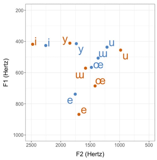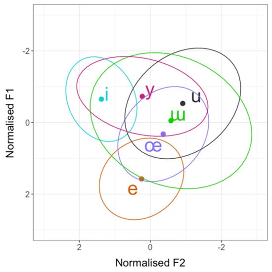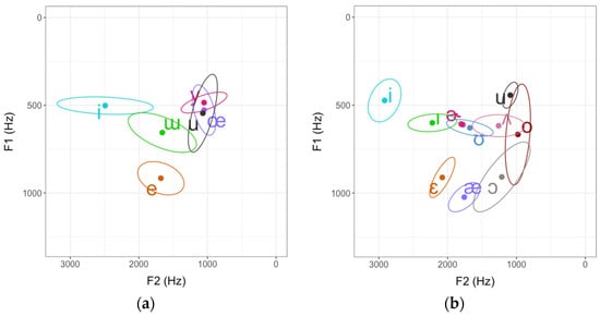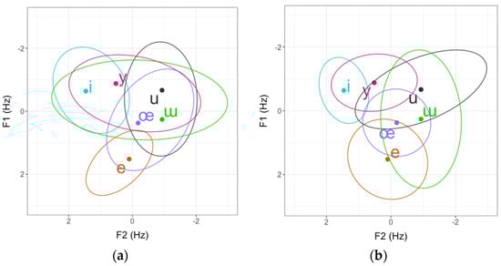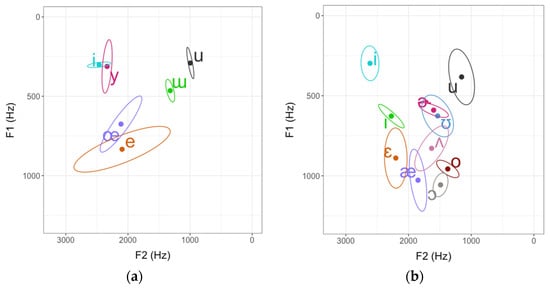 Plotting the vowel F1 and F2 values further demonstrates the differences between the groups (Figure 5a,b). In comparison to the regional group, the urban residence group tended to produce the target vowels /y, u, œ, ɯ/ in largely the same regions of the vowel space, with the centroids of the ellipses for the vowels /u, œ, ɯ/ clustered closely together. It needs to be noted that even for the regional group, the ellipses for several vowels are quite large and overlap, indicative of interspeaker variation, which is discussed in detail in Section 3.3.