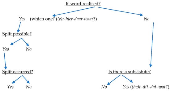 | 17 | Viz. which preposition? does an R-word occur, yes or no? if so, then which one: (e)r-hier-daar-waar ? if no R-word occurs, is there a substitute, yes or no? if no R-word occurs and there is a substitute, is it one of these pronouns (he)t-dit-dat-wat? can the PP containing an R-pronoun be split? if splitting is possible, then does it occur, yes or no? type of split. |