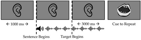 - The cue to repeat the sentence aloud, beginning after the 3000 ms offset period and indicated by the drawing of the ear changing to the drawing of a mouth.
