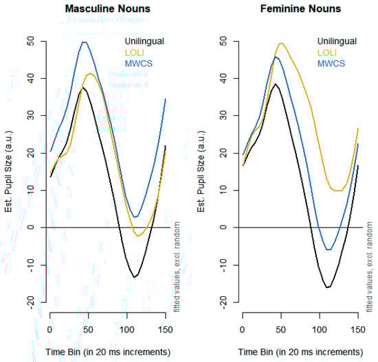 To summarize the findings discussed above, masculine nouns in the MWA condition elicited overall larger pupillary responses compared to the Unilingual condition, while masculine nouns in the LOLI condition differed only in their trajectory when compared to the Unilingual condition, eliciting larger pupillary responses towards the middle of the epoch only (see Figure 2). For feminine nouns, only those in the LOLI condition differed from the Unilingual condition, eliciting both a larger overall pupillary response as well as a more sustained pupillary response towards the end of the epoch (see Figure 2). While feminine nouns in the MWA condition did not differ from those in the Unilingual condition, neither did they differ from feminine nouns in the LOLI condition.