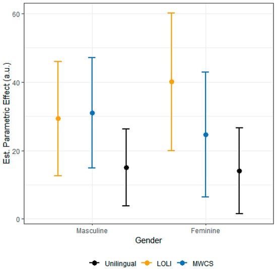 The following supporting information can be downloaded at: https://www.mdpi.com/article/10.3390/languages7040267/s1, Table S1: Experimental Stimuli; Table S2: Model summary with reference level of Unilingual, Masculine; Table S3: Model summary with reference level of Unilingual, Feminine; Table S4: Model summary with reference level of LOLI, Masculine; Table S5: Model summary with reference level of MWA, Feminine; Audio S1: 131_Unilingual_pantallas.wav (Unilingual, Feminine); Audio S2: 156_Unilingual_anillo.wav (Unilingual, Masculine); Audio S3: 221_LOLI_earrings.wav (LOLI, Feminine); Audio S4: 246_LOLI_ring.wav (LOLI, Masculine); Audio S4: 311_MWCS_silver earrings.wav (MWA, Feminine); Audio S5: 336_MWCS_shiny ring.wav (MWA, Masculine).