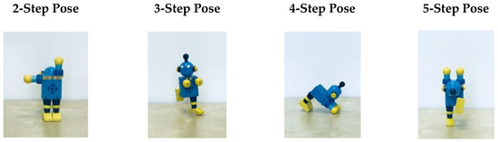 Small wooden robots (12-cm tall; Tobar) were used (See Figure 1). Each robot can be manipulated to move its limbs and head into different positions (video demonstration can be found in OSF, https://osf.io/q6wfn/ accessed on 12 October 2022). The limbs and head of the robot are connected to the body with an elastic cord, and the body contains spaces next to each limb and head, allowing for movement into the joints. The limbs and head of the robot can move into a total of 16 different positions. At each session, children saw three robots out of six. The selected robots were functionally identical but varied in color, head shape, foot shape, and body markings.