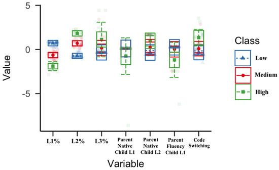 Two Latent Profile Analyses were performed to find out the best number of latent profiles based on children’s language exposure information with the sample from each approach: L1% exposure, L2% exposure, L3% exposure, at least one parent native in the child’s L1 (Yes = 1; No = 0), at least one parent native in child’s L2 (Yes = 1; No = 0), average parental fluency in child’s L1 (0–4), Code Switching (0–30). For LPA, we looked at the model fit of identifying two to six latent profiles. Based on the fit indices AIC, AWE, BIC, CLC, and KIC (Akogul and Erisoglu 2017), an analytic hierarchy process suggested the best solutions for the samples were Model 1 with three classes. The three classes were labeled as Low, Medium, and High multilingual exposure (See Figure 2 of LPA with the sample from Approach 1).