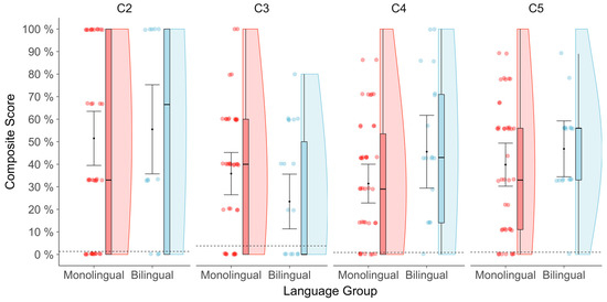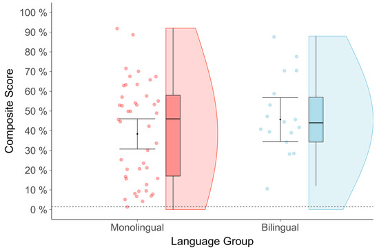 total_composite_percentage_score ~ lang_group (Monolingual vs. Bilingual) + L3%_exposure + child_sex + age_centered + edu_centered + income_centered + pvt_perc