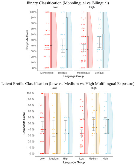 A total of 58 children were clustered in the Low multilingual exposure group, 27 in the Medium multilingual exposure group, and 16 were classified in the High multilingual exposure group. Table 7 shows the coefficient estimates from the best fitting model with the identified profiles as the main predictor, and Figure S3 displays them. There was no significant difference among the multilingual exposure profiles (Low vs. Medium/Low vs. High). Additionally, for every added step to the pose in the Test phase, we could predict a 3.4% reduction in their composite score.