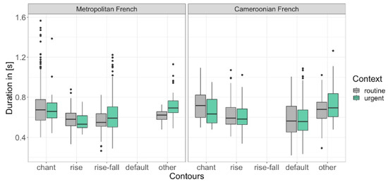 The results of our Discourse Completion Task, adapted from Arvaniti et al. (2016) and Quiroz and Żygis (2017), tend to confirm previous descriptions of Metropolitan French regarding the preference for specific contours in particular pragmatic contexts. Whereas the chanting contour is most frequently realized in a routine (i.e., call for dinner) context, a rising-falling contour is favored in an urgent (i.e., call due to a broken vase) context. In contrast, in Basaá-Cameroonian French, the context has less influence on the choice of prosodic contour and a contour consisting of the surface realization of lexical tones is favored in both routine and urgent context. Target use of vocative calls in Basaá-Cameroonian French thus does not amount to target-like use of the original standard target language, Metropolitan French (Williams 1989). Our results are consistent with previous studies showing a transfer of lexical tones onto the contact variety of an intonation language. In our perspective, the semantic deviance (Mennen 2015) from Metropolitan French observed in our Basaá-Cameroonian French speakers also corroborates what has been observed in other studies involving the pragmatics-prosody interface, that the more marked a prosodic pattern is (here, the vocative chant), the more difficult it is to acquire (Eckman 1987).