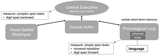 In the same vein, investigating the combined effects of bilingualism and DLD, current research focuses on cognitive effects of bilingualism in terms of a potential bilingual advantage (see the review by Bialystok (2011), the Special Issue in Behavioral Sciences (van den Noort et al. 2019), and the recent Special Issue in the Journal of Cultural Cognitive Sciences (Mishra and Abutalebi 2020) regarding the difficulties in replicating bilingual advantage effects). Studies have reported that bilingualism can have positive effects on cognitive domains such as attentional control, metalinguistic awareness, abstract and symbolic representation and also working memory (e.g., meta-analysis of Adesope et al. 2010; Grundy and Timmer 2017). In the meta-analysis by Grundy and Timmer (2017) focusing on working memory capacity, a significant, small to medium effect size of 0.20 was found in favor of greater working memory capacity for bilinguals than monolinguals (results from 88 effect sizes and 27 independent studies). Their analyses further revealed that the largest effects were observed in children compared to other age groups. Since the bilingual advantage is so controversial in former scientific discourse, the present study focuses on the potential effects bilingualism has on working memory by specifically considering children with DLD and weak working memory skills. Before reviewing previous studies, we will introduce the concept of working memory.