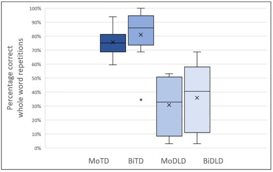 Boxplots representing the NWR results for whole word accuracy in MoTD, BiTD, MoDLD and BiDLD groups (vertical line = Mdn, x = M; circle = outlier).