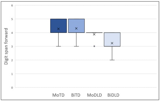 As has been shown in the previous section, we found similar outcomes for both measures of VSTM, namely DS-FW and NWR. Both are vulnerable in children with DLD, but no differences could be found between monolingual and bilingual children regarding these measures (see Figure 2 and Figure 3 for illustration).