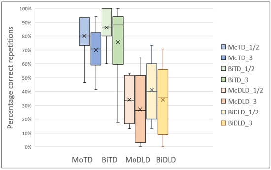 The participating children were tested with the short version of the German LIT-MUS-QU-NWR (see Grimm and Hübner, forthcoming; Grimm 2022). NWR-tasks are said to avoid disadvantages for bilingual children with potentially smaller lexical knowledge than their monolingual peers. NWR tasks are culturally fair, do not discriminate against bilingual children and are considered to be independent of socio-economic status (Chiat 2015; Chiat and Polišenská 2016; Engel et al. 2008). As children with DLD often have difficulties with phonological complexity (cf. de Almeida et al. 2019) that could potentially affect the repetition of nonwords, we chose this newly developed tool (LITMUS-QU-NWR) which systematically varies phonological complexity. Although it was not developed to measure working memory capacities in the first place, word lengths differ between one and three syllables in this test and therefore should have different effects on working memory. To investigate a potential influence of word length, we analyzed the whole word accuracy of children’s nonword repetitions (see Section 3.2).