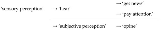 - Evans, Nicholas, and David Wilkins. 2000. In the mind’s ear: The semantic extensions of perception verbs in Australian languages. Language 76: 546–92. [Google Scholar] [CrossRef]