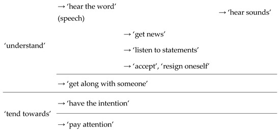 As in the previous section, I dedicate Section 3.2.1, Section 3.2.2, Section 3.2.3 and Section 3.2.4 to the main meanings of this word: ‘to direct thinking’, ‘to hear’, ‘to have the intention’, and ‘to perceive through intelligence’, without taking into account in the distribution of the sections, for the moment, the distinction between the relations that the meanings of the polysemous words and the possible semantic extensions that derive from them always have with each other. Further on, in Section 4.1.2, all of this is brought together to make a systematic semantic analysis of the verb from the point of view of cognitive semantics.