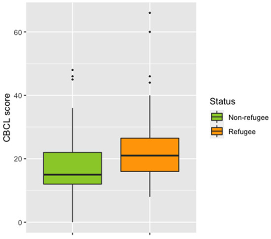 Results are illustrated in Figure 1. Refugee children showed significantly higher scores to the CBCL (M = 25.1, SD = 14.3) than non-refugee children (M = 18.8, SD = 12.3), as attested by the Wilcoxon–Mann–Whitney test (W = 266, p = 0.040), with a moderate effect size (r = 0.275). Since high scores indicate increased vulnerability, this result shows higher emotional vulnerability in refugee children.