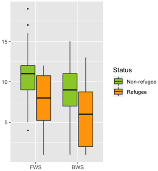 Digit spans. Results are illustrated in Figure 2. The best model fitting FWS has refugee status as significant predictor (F(1, 34) = 11.46, p = 0.002, Adjusted R2 = 0.23), which is significant (β = −3.42, t(34) = −3.39, p = 0.002). The best model fitting BWS also has refugee status as predictor (F(1, 34) = 26.35, p < 0.001, Adjusted R2 = 0.42), also significant (β = −4.79, t(34) = −5.13, p < 0.001). Predictors involved in best fit models are summarized in Table 1.