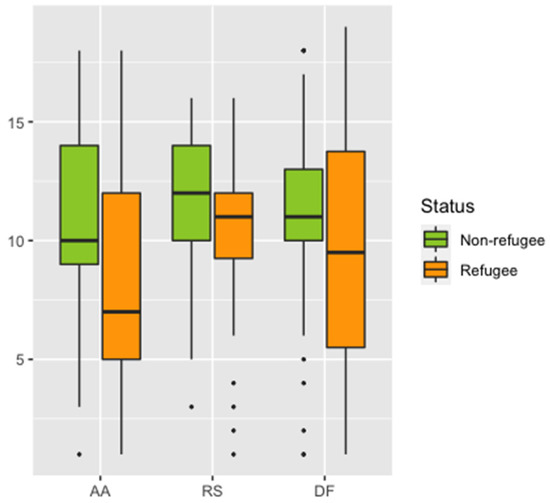 Distribution of refugee and non-refugee children’s scales scores to auditory attention (AA), response set (RS) and design fluency (DF) tasks.