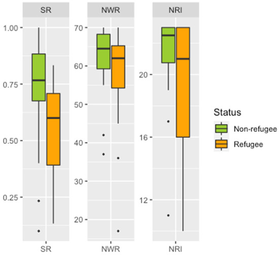 Distribution of bilingual refugee and non-refugee children’s scores to the LITMUS tasks: LITMUS-SR-French (SR), LITMUS-QU-NWR (NWR), no-risk index (NRI).