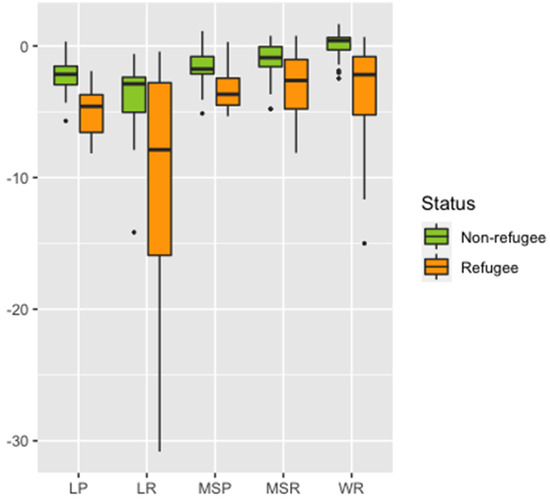 Distribution of bilingual refugee and non-refugee children’s z-scores to the standardized language tasks: lexical Production (LP), lexical reception (LR), morphosyntactic production (MSP), morphosyntactic reception (MSR), word repetition (WR).