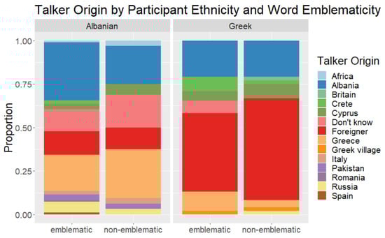 Looking at the findings about the origin of the stimuli talkers in relation to the ethnicity of the participants, we see that Greek listeners are more prone to identifying the stimuli talkers simply as foreigners than Albanian listeners are in doing so (Figure 1). The latter listeners are comparatively more prone to identifying the talker as Albanian or even Greek. We see a tendency, then, of Greeks not making specific identifications, and of Albanians identifying the non-SMG talker as a fellow Albanian or a member of the majority community. This last finding further suggests that Albanian listeners are more tolerant than Greek listeners are about assigning non-SMG variants to Greeks.
