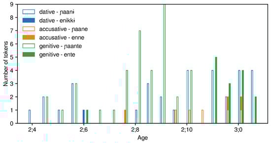 The accusative affix is additional morphological material on the noun. The utterances indicate that the children know that these nominals are ‘objects’ in the syntactic structure, though their errors suggest that the accusative–animacy correlation that determines DOM is as yet incomplete. It is also important to note that the allomorph that is applied is appropriate to the noun in question (booɭi-ne ‘ball’ vs ʈein-e ‘train’) and the errors lie in the presence of such overt marking and not in the selection of the particular variant.