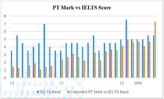 The results are presented in a cluster bar chart (Figure 2). It was noticed that the IELTS scores for most of the students are higher than their marks on PT (converted).