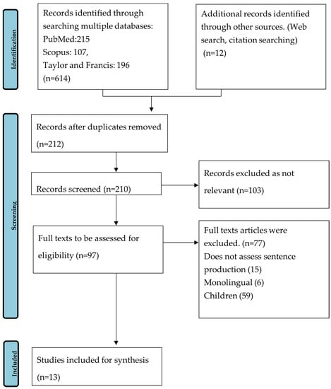 A priori protocol was established based on a scoping review guideline—PRISMA Extension for Scoping Reviews (PRISMA-Scr; ) and a guideline by (). Our initial search was conducted on three electronic databases: MEDLINE, SciVerse Scopus, and Taylor and Francis. These databases cover a broad range of disciplines within the field of health sciences, specifically aphasia. The search was limited to articles written in English and published between 1990 and 2021. The search consisted of keywords relevant to bilingualism, aphasia, and verbal production. The Boolean phrases used were: ((((((((bilingualism) OR (bilingual)) OR (multilingual)) OR (multilingualism)) OR (trilingual)) OR (trilingualism)) OR (dual language)) AND (((aphasia[MeSH Terms]) OR (agrammatic)) OR (agrammatism))) AND ((((sentence) OR (syntactic)) OR (syntax)) OR (word order). All citations were imported into a Mendeley bibliographic manager, which automatically removed duplicated citations. Prior to the screening process, additional duplicates were manually identified and removed.