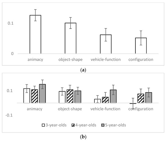 Did the average TF increase differ across classifier types and age groups? A 4 × 3 mixed model ANOVA with the within-subject factor of classifier type (animacy, configuration, object shape, vehicle function) and the between-subject factor of age groups (three-, four-, and five-year-olds) analyzed the average TF increase. A significant main effect of classifier type emerged (F(3,207) = 3.00, p = 0.03, ηp2 = 0.04), but neither the main effect of age group (F(2,69) = 1.82, p = 0.17) nor the classifier type × age group interaction (F(6,207) = 0.54, p = 0.78) was significant, suggesting that children’s performance differed across classifier types for all age groups. Since children’s performance did not differ by age group, post-hoc analyses analyzed the three age groups’ combined data. Descriptive analyses showed that animacy classifiers had the highest average TF increase (M = 0.13, SD = 0.16), followed by object shape (M = 0.10, SD = 0.16), vehicle function (M = 0.06, SD = 0.18), and configuration (M = 0.05, SD = 0.20) classifiers (Figure 1). Post-hoc analyses first compared the configuration and vehicle function classifiers (the two types of classifiers with a lower average TF increase) against animacy classifiers. Two paired sample t-tests showed that the average TF increase was higher with animacy classifiers than with configuration (t(71) = 2.60, p = 0.01) and vehicle function classifiers (t(71) = 2.30, p = 0.02). A significance cutoff level of 0.025 [0.05/2] was used in two-comparison t-tests. Then, two paired sample t-tests compared the configuration and the vehicle function classifiers against the object shape classifiers. Results showed that the average TF increase did not differ between the object shape and configuration classifiers (t(71) = 1.72, p = 0.09) or between the object shape and vehicle function classifiers (t(71) = 1.48, p = 0.14).