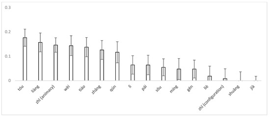Figure 2. The TF increase for each classifier across all participants. The TF increase significantly exceeded 0 for tóu, liàng, zhī (animacy), wèi, tiáo, zhāng, qún, but not for , pái, sōu, míng, gēn, liè, zhī (configuration), shuāng, and jià. Error bars reflect SEM. The means (standard deviations) are provided here: tóu: 0.18 (0.29); liàng: 0.16 (0.31); zhī (animacy): 0.15 (0.25); wèi: 0.14 (0.34); tiáo: 0.14 (0.32); zhāng: 0.13 (0.32); qún: 0.12 (0.36); : 0.06 (0.31); pái: 0.06 (0.33); sōu: 0.05 (0.29); míng: 0.05 (0.36); gēn: 0.05 (0.28); liè: 0.02 (0.33); zhī (configuration): 0.008 (0.33); shuāng: −0.005 (0.35); jià: −0.02 (0.31).
