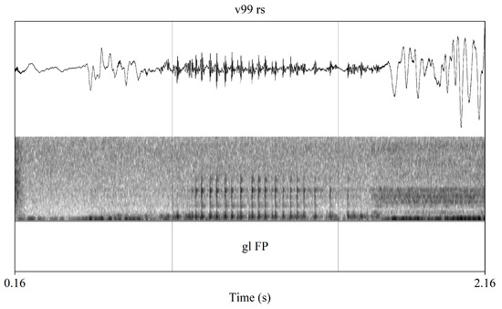 Section showing a 2 s selection (spectrogram: 0–8 kHz) from the Pool2010 corpus (speaker: v99 in Lombard condition) showing a glottal filler particle (gl FP).