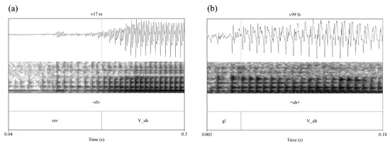Sections (spectrogram: 0–8 kHz) from the Pool2010 corpus (speakers: v99, v17) showing filler particles (a) with initial creaky voice (crv) and (b) with two initial glottal pulses (gl). Note that in 2a only the first 260 ms of the FP are shown.