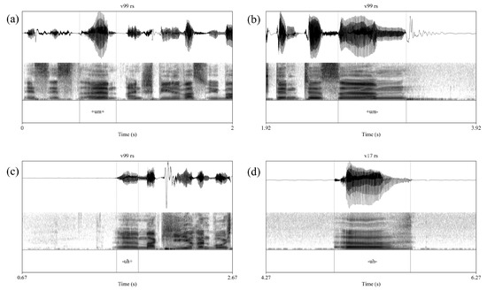 - Belz, Malte. 2017. Glottal filled pauses in German. In Workshop on Disfluency in Spontaneous Speech (DiSS 2017). Stockholm: KTH Royal Institute of Technology, pp. 5–8. [Google Scholar]