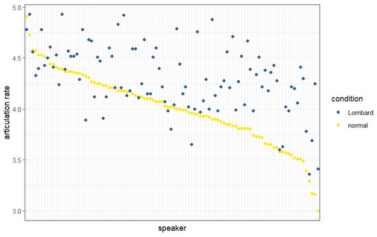 Figure 4 shows that the articulation rate for most speakers in the Lombard condition is actually faster than in the normal condition, contrary to previous findings (Tuomainen et al. 2021), although Tuomainen et al. (2021) raise the question of whether the differences in articulation rate are perceptually salient (cf. Quené 2007). Deviations from the articulation rate reported in Jessen (2007) on the same corpus can be explained by our use of the script. The authors of the script report that automatic values are generally lower than manually obtained values, and need to be multiplied by 1.28 to predict the manual values (de Jong and Wempe 2009). This is due to the failure of the script to detect certain unstressed syllables; thus, fewer syllables are counted, leading to a lower articulation rate. Jessen (2007) reported a mean articulation rate of 5.21 syll/s in the normal speech condition, while the automatically obtained mean value for the same data is 4.0 syll/s. When using the factor reported above to predict the manual mean values from our automatically obtained mean, we found that this conversion approximated the manual value quite well (4.0 × 1.28 = 5.12).