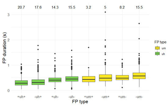 The duration of FPs is highly variable, as can be seen by the high standard deviation values in Table 1 for each phenomenon. Glottal FPs have the shortest duration (and the highest standard deviation), followed by the vocalic type (uh), the nasal type (hm), and the vocalic-nasal type (um), with the last being the longest. The vowels in uh are longer than in um.