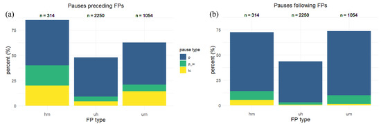 Percentage of different FP types (a) preceded and (b) followed by a pause. The colours show different types of pauses: simple pause (p), waiting pause (p_w), and task change (tc). The values at the top show the values representing 100% for each FP type.