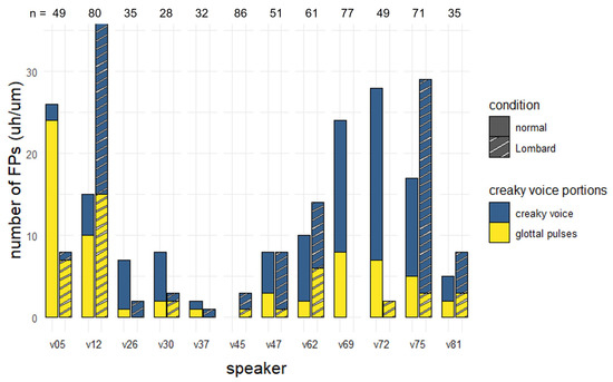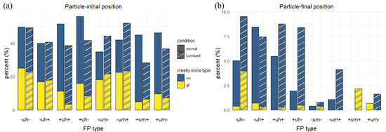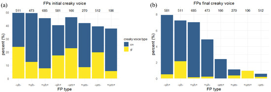 Creaky voice portion at (a) the beginning and (b) the end of FPs. The values at the top show the values representing 100% for each FP type. Note that the scales of the graphs are different, as there are considerably fewer FPs including creaky voice or glottal pulses at the end of the FP.