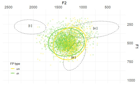 As seen in Figure 8, the vowels of the FPs uh and um show a high degree of overlap, which is further supported by the Pillai-score of 0.03. The Pillai score is a measure of overlap, ranging from 1 (no overlap) to 0 (complete overlap) (Kelley and Tucker 2020); it is determined by conducting a multivariate analysis of variance (MANOVA) using the first and the second formants as response variables and the FP type as the predictor variable. A Pillai score was calculated for each corner vowel as well, in order to measure the overlap of each lexical vowel with the FP vowel. The values support the relationship between vowels that can be seen in Figure 8. The high front vowel has little overlap with the FPs (Pillai = 0.8); the German central [a:] has more overlap (Pillai = 0.5), and the high rounded back vowel has even more overlap (Pillai = 0.3). It is important to note that the number of tokens for [u:] is considerably lower than for the other two corner vowels.
