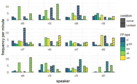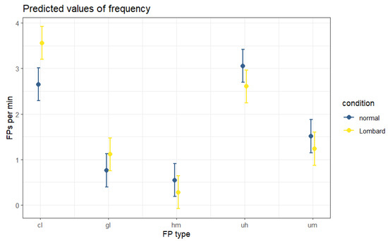 The rate of FPs in normal speech (8.67 FPs/min) and Lombard speech (8.69 FPs/min) appear stable. However, when looking at the different FP types it becomes apparent that they are not as stable as the overall rate suggests. This is determined using a linear mixed model, with the rate of each FP type per speaker as the dependent variable, the FP type, condition, and articulation rate as independent variables, and the speaker as a random intercept: . The effect plot in Figure 9 shows that the rate of clicks and glottal FPs increases in the Lombard condition; the model (see Table A2 in the Appendix A) shows that the difference in conditions is not significant for the glottal FPs. The rate of the FPs uh, um, and hm decreases in the Lombard condition, and this difference is statistically significant. While articulation rate is included in the model, the factor does not reach statistical significance, i.e., it has no influence on the frequency of FPs. Possible reasons for these results are outlined in the discussion in Section 5.6.