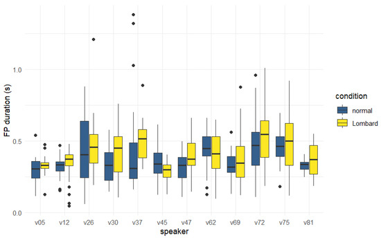 To determine the influence of condition on FP duration, the following model was fitted: . The model output can be seen in Table A3 in the Appendix A. It shows that FPs in the Lombard condition are on average 48 ms longer than in the normal condition, with the vocalic-nasal FP um being 162 ms longer than the other FPs. The pause context has an effect on the duration, in that FPs are shorter when no pause precedes or follows the FP. The pause after an FP has a larger effect on duration (−109 ms) than the pause before an FP (−37 ms). The articulation rate is included as the control variable; however, it has no influence on FP duration. Furthermore, the aforementioned duration hierarchy is applicable, with the pause context affecting the duration of uh and um to a similar degree.