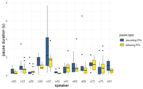 The duration of the pauses surrounding an FP varies to a high degree, as indicated again by the high standard deviation values (Table 2). A linear model including pause type (simple, waiting, task change) and pause position (pre-FP, post-FP) as predictors for pause duration indicates that the three different pause types (simple, waiting, task change) are significantly different from one another (Table A1). Furthermore, while simple pauses (p) and task changes (tc) do not differ in their duration depending on pause position, waiting pauses (p_w) do differ significantly in their duration. These pauses are longer before an FP than after an FP.