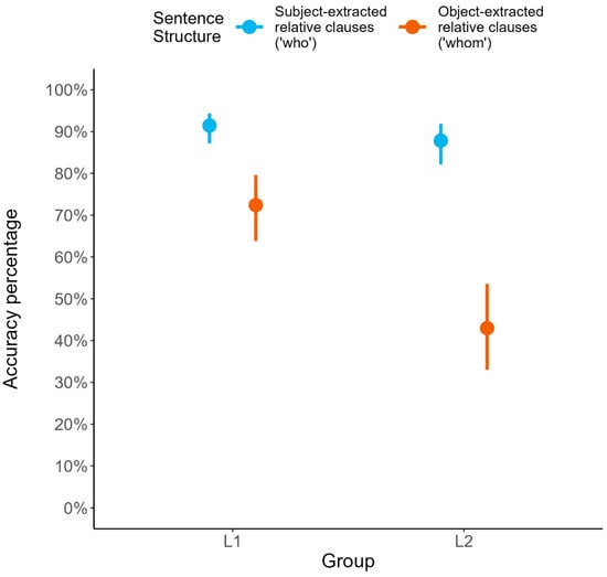 Interaction of sentence structure by group on accuracy rates in Experiment 1. Error bars represent 95% confidence intervals.