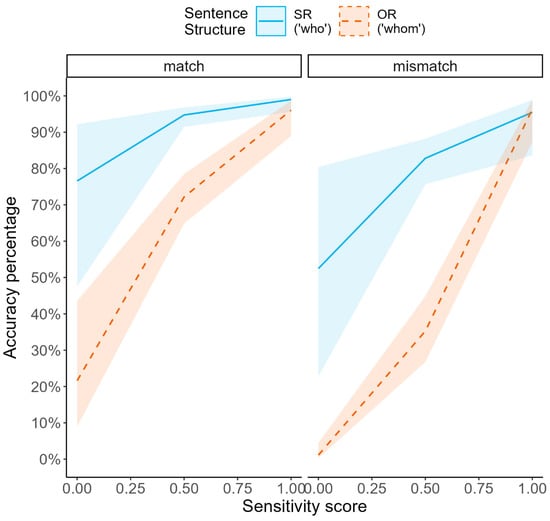 Overall, L1 speakers are expected to respond faster and more accurately than L2 speakers overall, based on evidence for L1–L2 differences in sensitivity to case information (e.g., ; ; ; ). Specifically, if L2 speakers are less able to make use of case information (i.e., have low morphosyntactic sensitivity), they might show disproportionate accuracy decreases in response to OR (vs. SR) clauses, in line with the SSH. This is because correct thematic-role assignment in SR trials may either be performed via deep syntactic parsing or via surface-level heuristics, as both routes convey the same reading. In contrast, in response to OR clauses, successful thematic-role assignment can only happen through the parsing and integration of morphosyntactic cues into a mental representation.